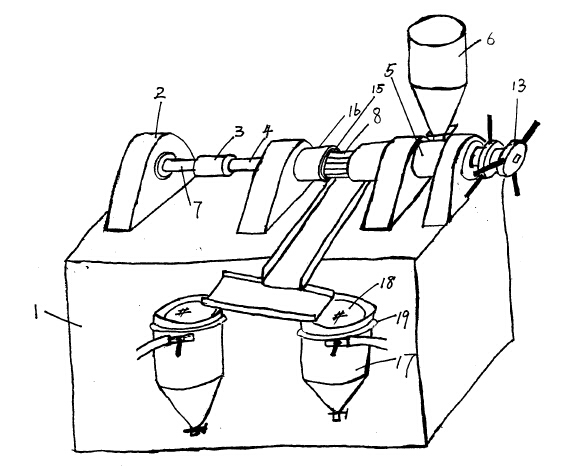 螺旋榨軸穿過料筒,并通過連軸節(jié)與減速箱動力輸出軸相連,螺旋榨軸的錐型前端和料筒前端的錐型縮口相配合形成擠出間隙,料斗放置在料筒上,并與料筒連通,螺旋榨軸的螺牙直徑保持恒定,螺旋榨軸螺谷從后端到前端逐漸變低,出渣口處有一錐型收縮口,通過螺旋榨軸的轉(zhuǎn)動,從料斗下來的原料沿螺谷向前運(yùn)動,并逐漸受到擠壓和摩擦,在料筒的錐型收縮口,擠壓加劇,油渣分離。油從料筒的出油口段流出,出油口段上加工有可以漏油的小孔或者縫隙,油渣從料筒錐型口擠出,錐型口處料筒和螺旋榨軸的擠出間隙可以通過螺旋榨軸后端和料筒后端之間的調(diào)節(jié)螺絲/螺母進(jìn)行調(diào)節(jié),螺旋榨軸的后端設(shè)有活動連接的螺絲,該螺絲和料筒上的固定螺母配合,螺母和料筒制成一體,料筒周邊安裝有加熱元件。加熱元件外包保溫材料,同時(shí)安裝有自動恒溫裝置對料筒周邊的加熱元件進(jìn)行溫度控制,螺旋榨油機(jī)還帶有真空濾油儲油罐,這樣使榨油過程和原料加熱同時(shí)進(jìn)行,并將出油溫度控制在適宜溫度,改變了油品質(zhì)量,減少了油的加工環(huán)節(jié)。